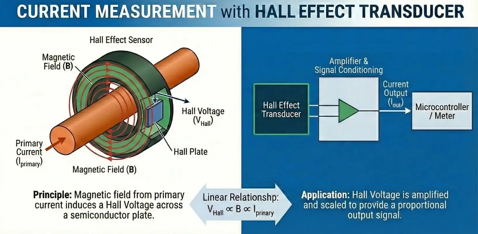 A Hall sensor placed near the conductor measures this field, producing a voltage proportional to current.