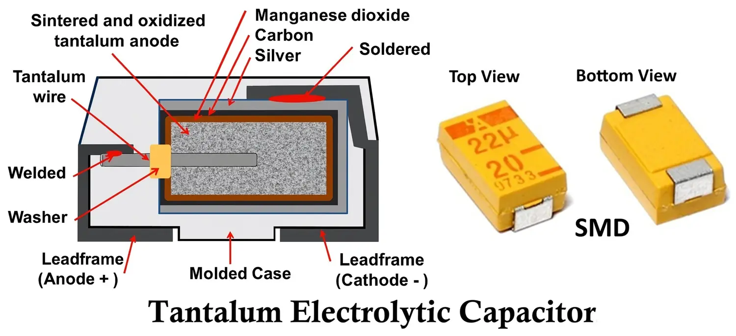Tantalum capacitors use tantalum metal powder pressed into a porous pellet.