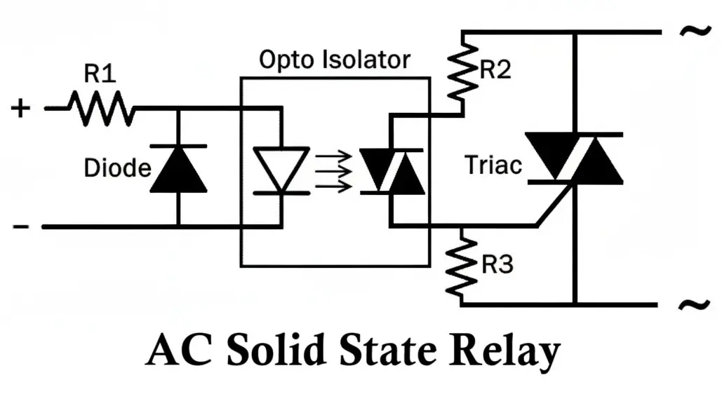 - Output Stage: Uses anti-parallel SCRs or a triac to handle the AC load.