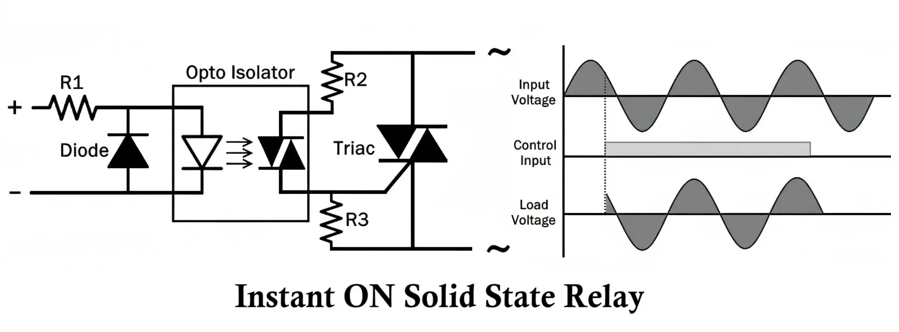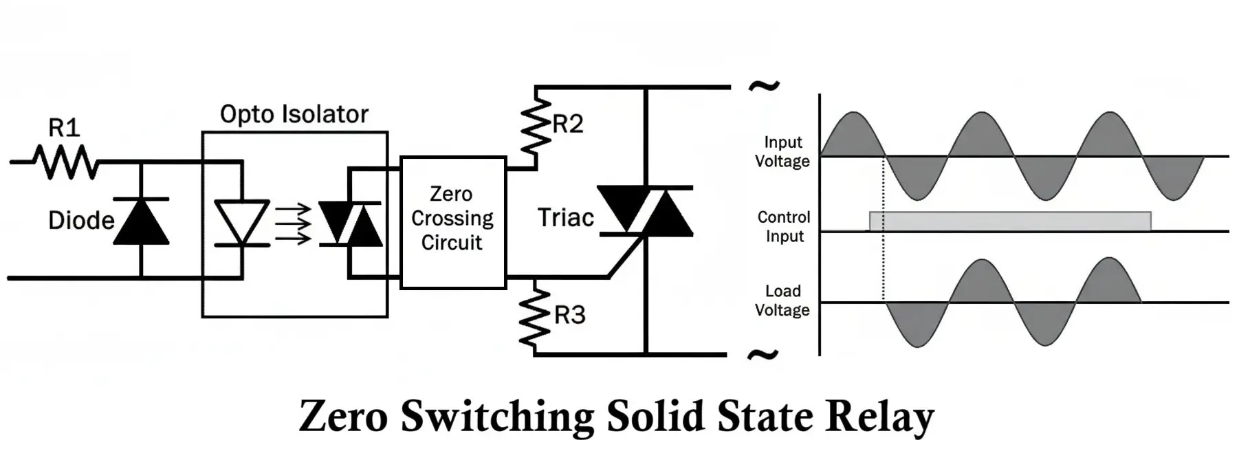 | Zero Switching SSR | Switches ON when the AC voltage crosses zero. | Reduces transients and noise. |