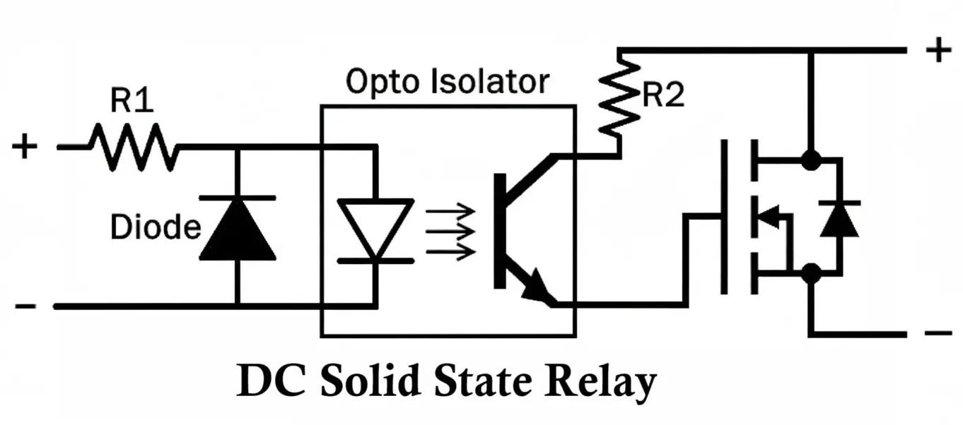 | DC SSR | MOSFET or Transistor | DC loads | Solenoid, LED, DC motor |