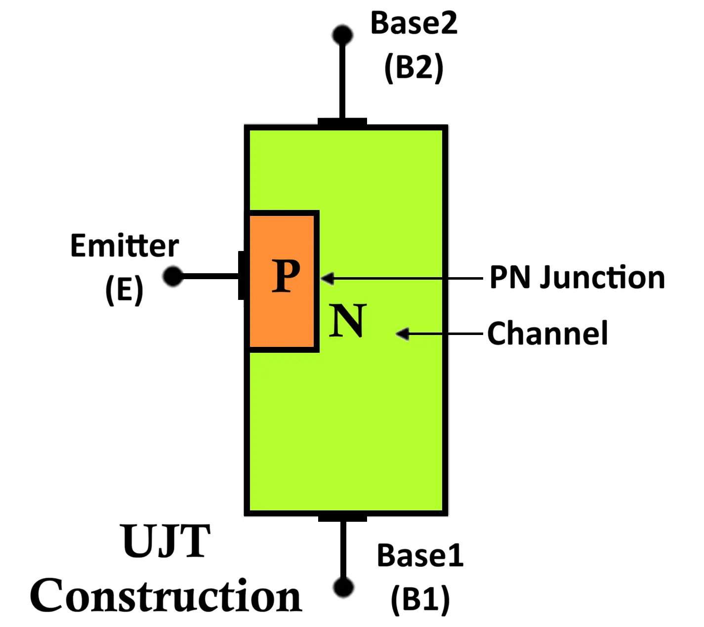 The construction of a unijunction transistor (UJT) is relatively simple compared to BJTs or MOSFETs: